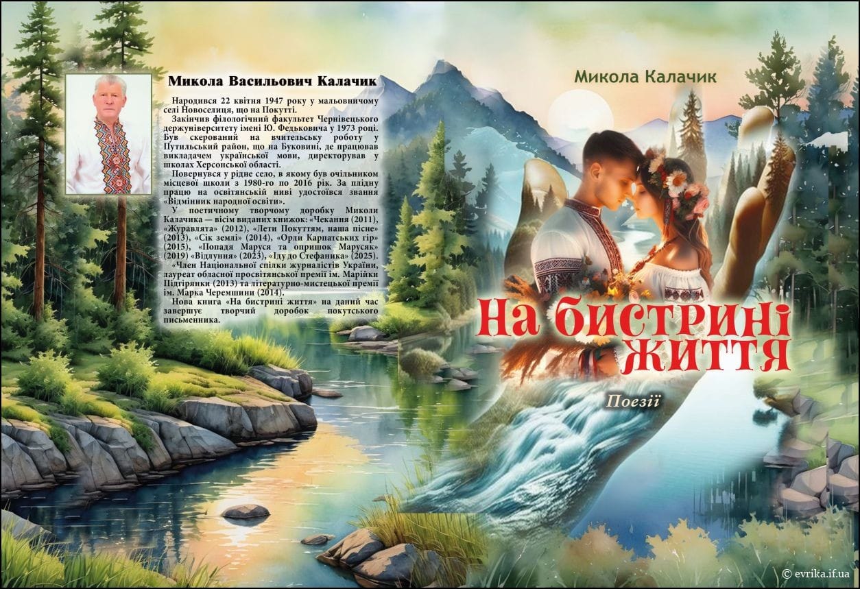 У дев’ятій поетичній збірці «На бистрині життя» письменник і журналіст Микола Калачик, що родом із села Новоселиця на Снятинщині, лауреат літературної просвітницької премії ім. Марійки Підгірянки та лауреат літературно-мистецької премії ім. Марка Черемшини, висвітлює (як і в попередній книжці «Відлуння») тему вірності й любові до рідної України, отчого краю, пошанівку до Бога, до батька-неньки, до своїх друзів по творчому ремеслу. Водночас засуджує і гнівно б’є поетичним рядком ворогів-нападників, агресорів-московитів, сподіваючись на священну ПЕРЕМОГУ над ворогом.